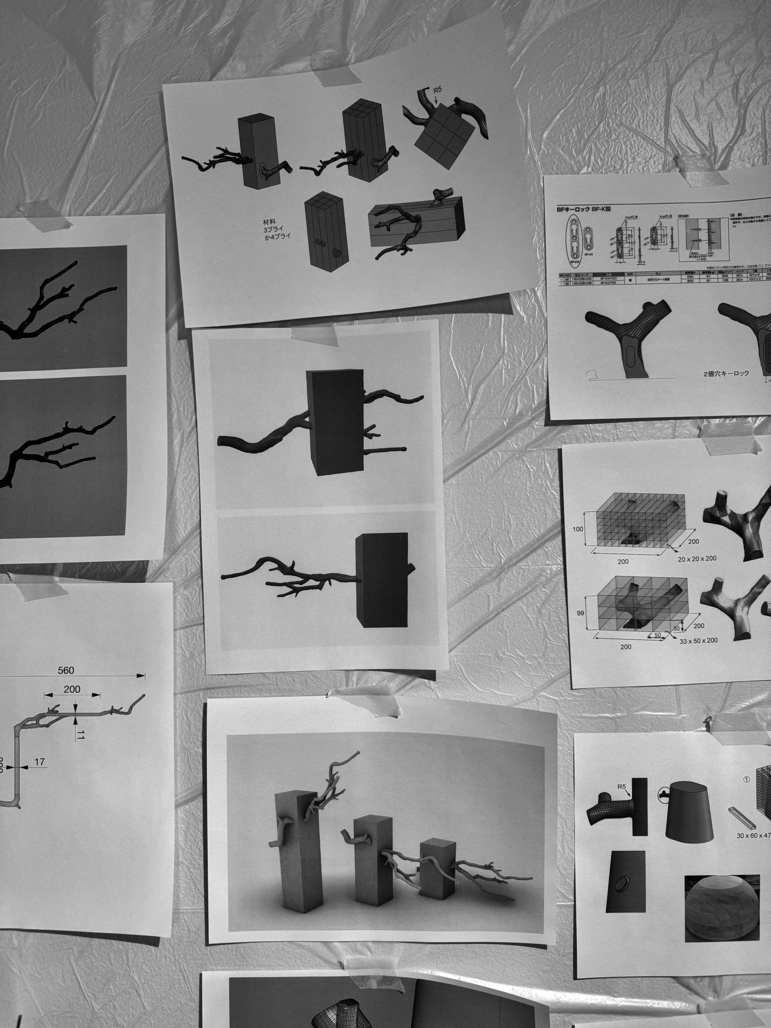 In this work, I began to consider whether these branches—left behind without purpose—could be given function and elevated into product design. Each branch is 3D scanned and converted into modeling data. With the cooperation of Karimoku Furniture, their forms are carved out of solid wood using CNC machining. In this process, a natural object is translated into data and then re-emerges as material. There is a continual movement back and forth between data and matter.